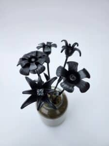 In this intense three-day class, students will learn how to split, neck, and shape steel pipe and square tubing to create various forged flowers, based on reality or your imagination. Using your blacksmithing and metalworking skill and techniques we will explore forming petals, stems, pistils, and leaves, including texturing and finishing. We will also utilize simple fullering tools for necking down as well as oxy-acetylene welding. Each student will complete a unique bouquet to take home. Students need to have some previous smithing and/or metalworking skill.